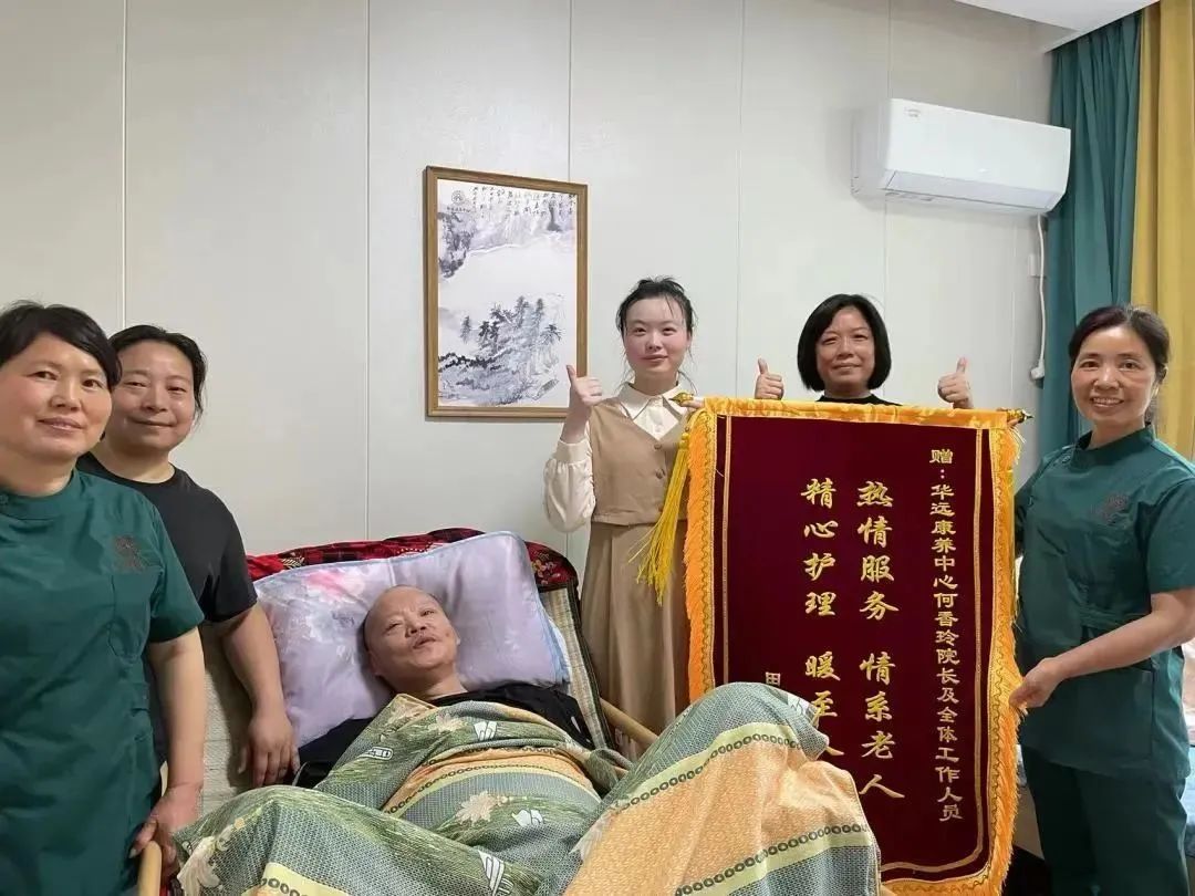 看到父親開朗的笑顏、從消瘦到有肉肉的身體、逐漸穩(wěn)定的血糖和血壓,作為女兒的小田的也慢慢覺得放心和慶幸。放心的把父親放在華遠康養(yǎng)中心照料,慶幸自己當初的選擇沒有錯。于是在天朗氣清的四月,她帶著一面紅彤彤的錦旗敲響了院長辦公室的門。
